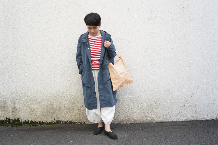 TOKIHOのシルクリネンのワンピースコートを羽織る。